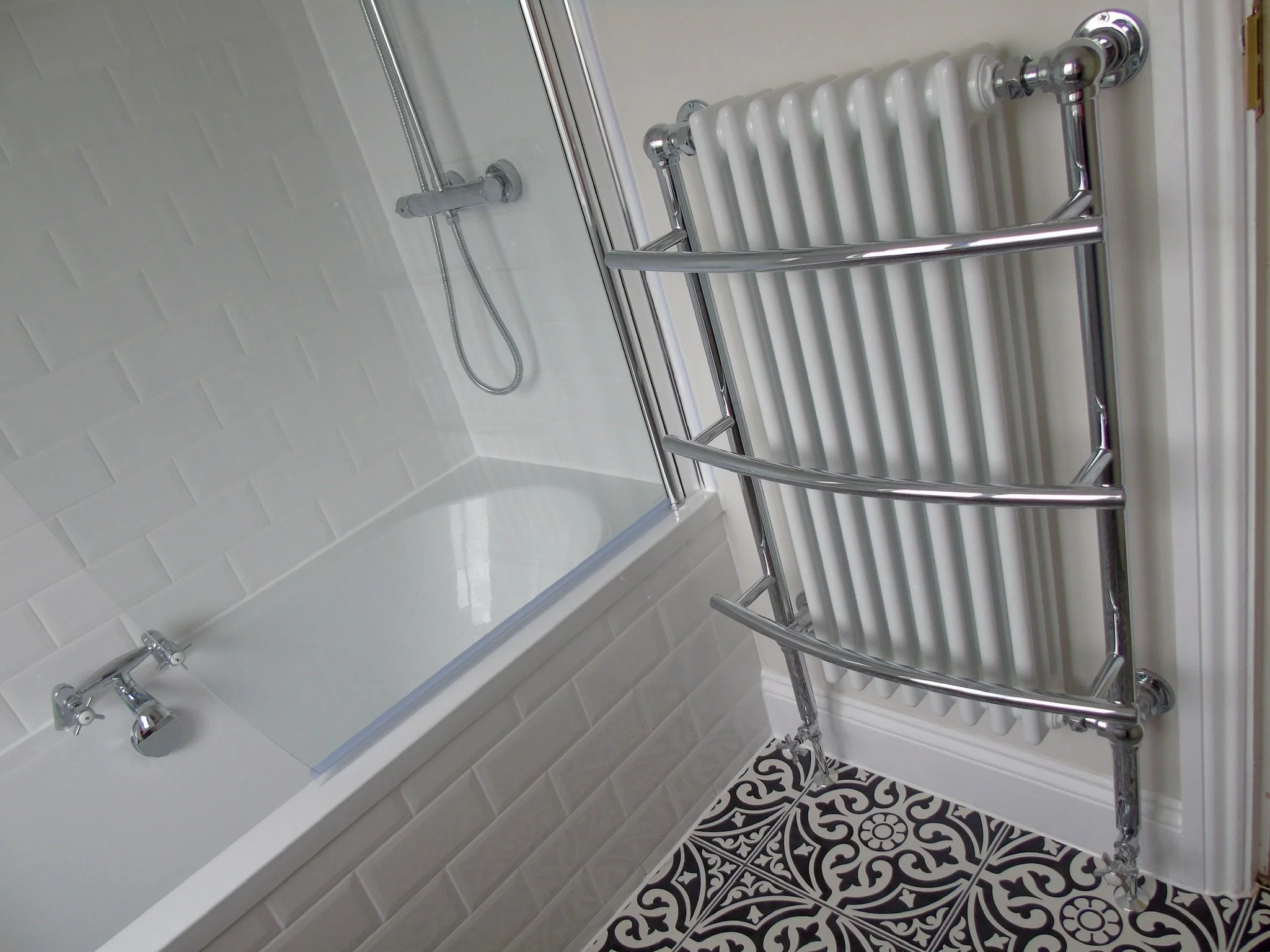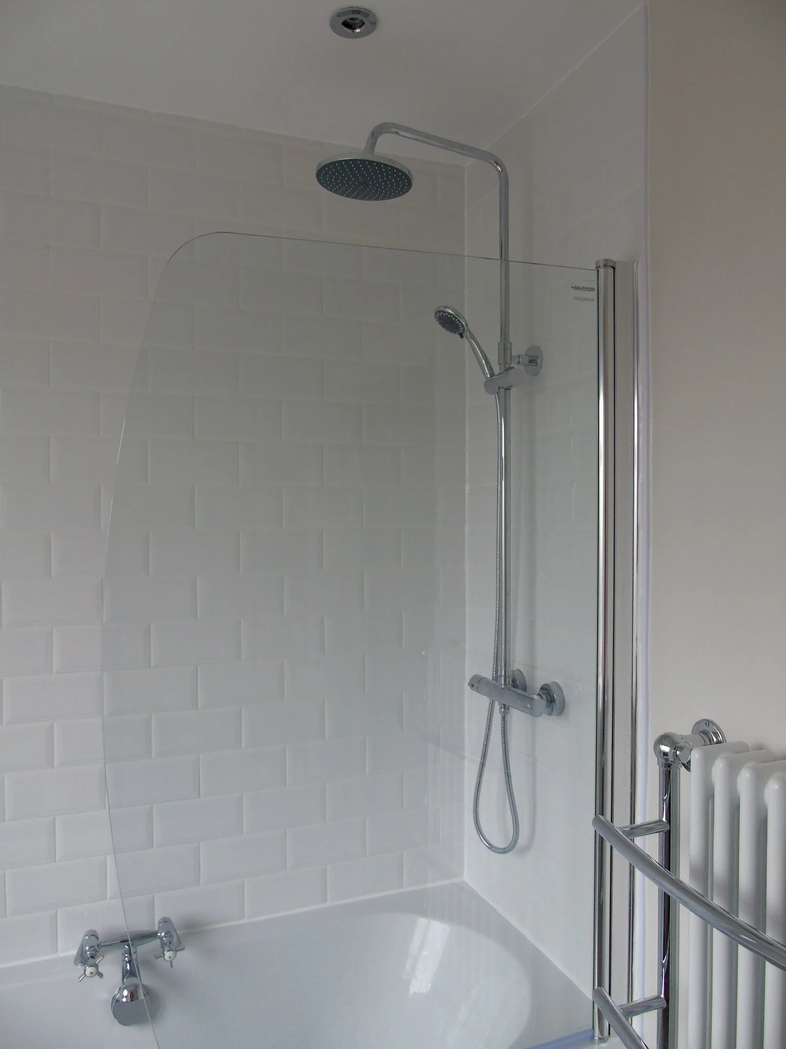 Walk in shower with low profile tray and fixed panel
