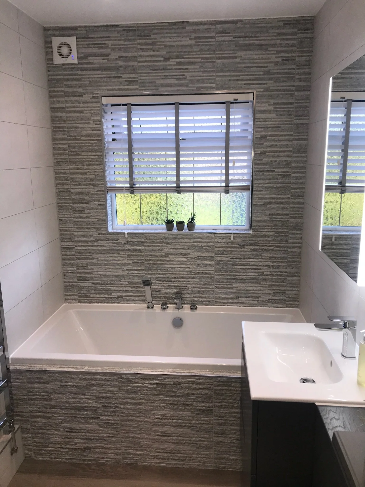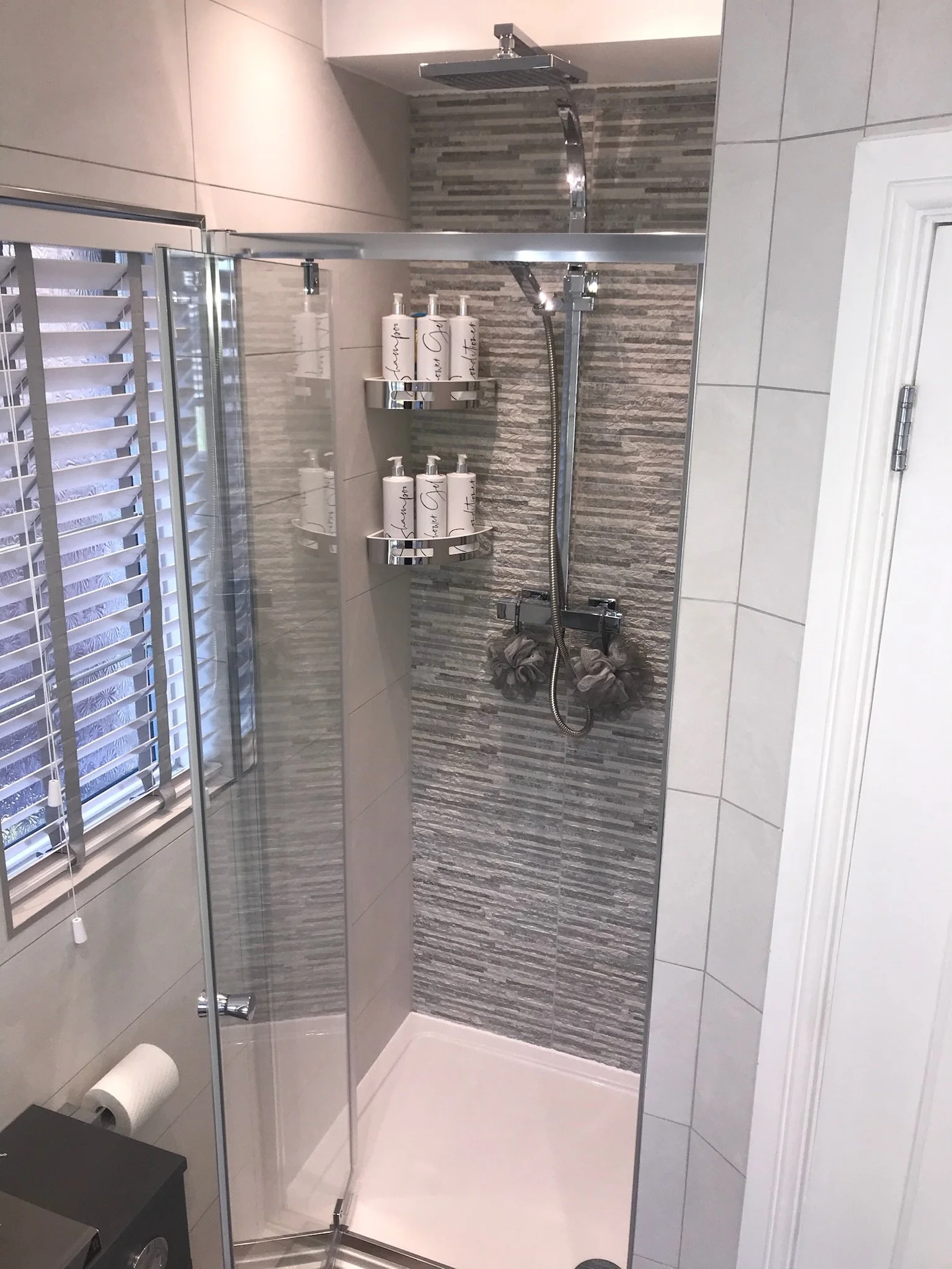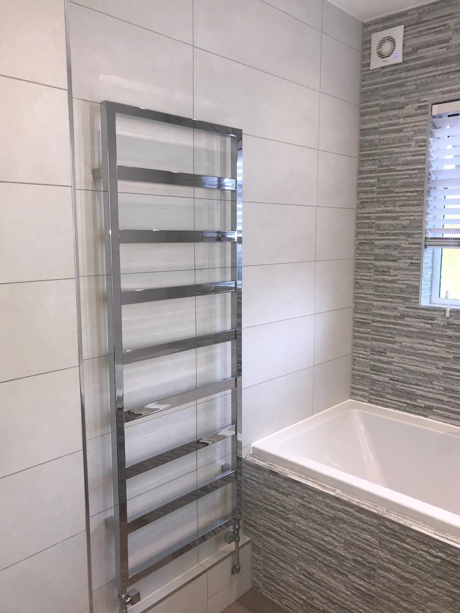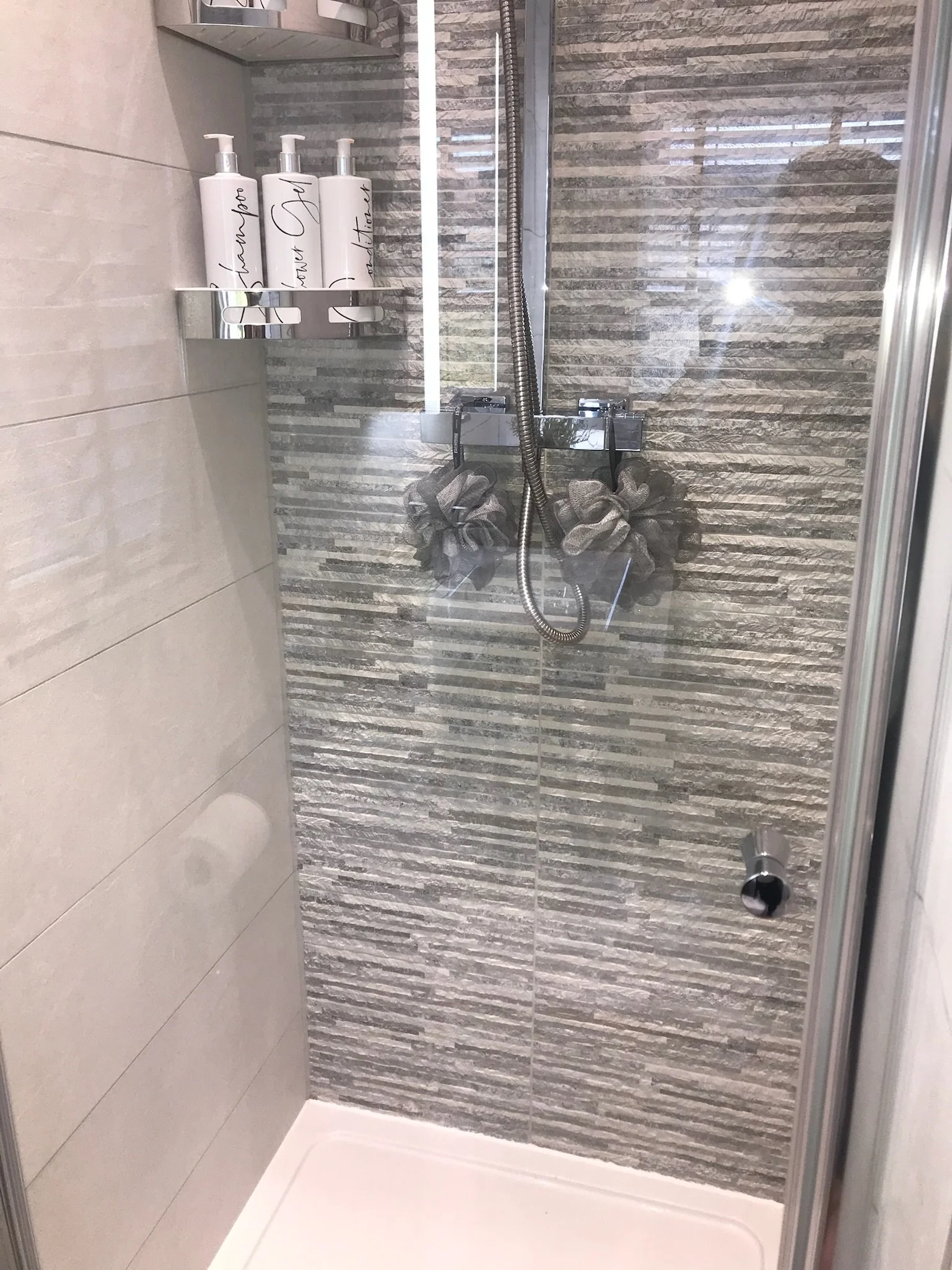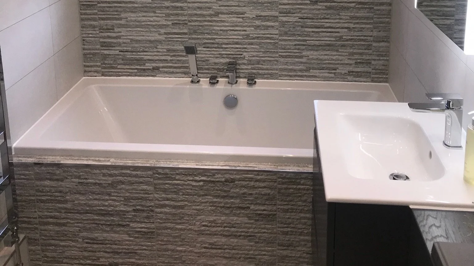 Shower enclosure and double ended bath with tiled panel