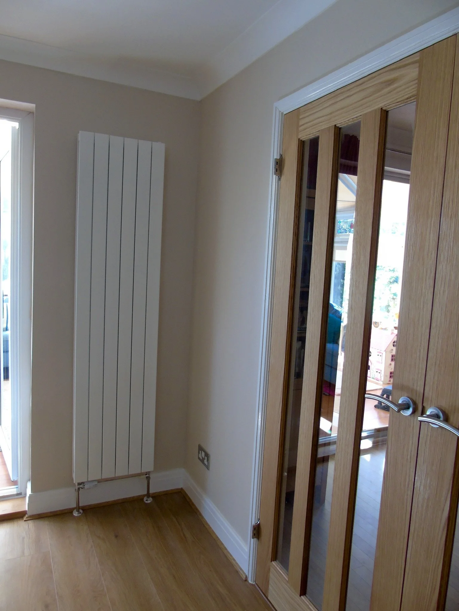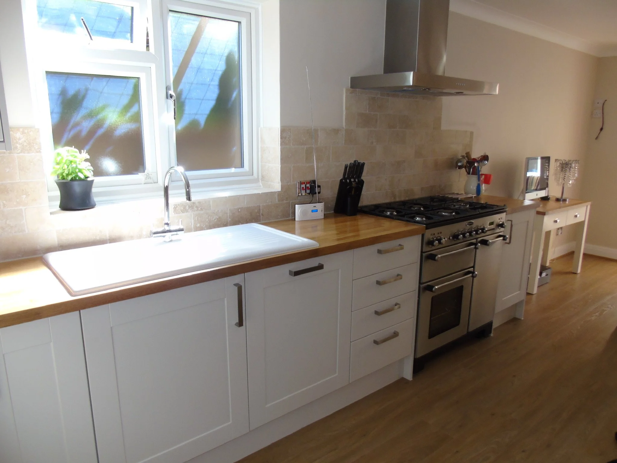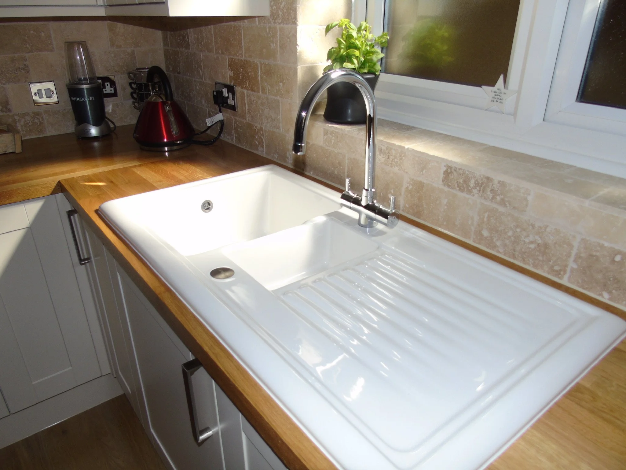 Shaker gloss white with solid oak worktops
